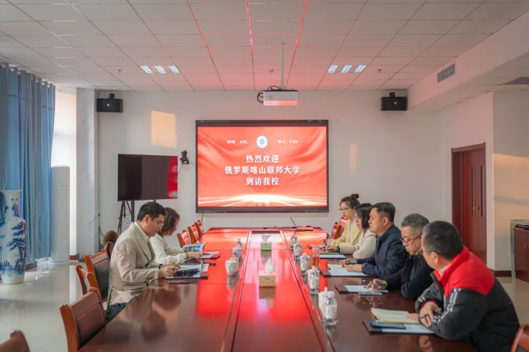 张达礼对山东文化产业职业学院的热情接待表示感谢,并介绍了喀山联邦大学的办学历史、学科实力及国际化布局。他表示,喀山联邦大学作为俄罗斯顶尖高校,在人文社科、艺术设计、自然科学等领域拥有深厚积淀,高度认同山东文化产业职业学院的合作愿景,此次来访恰逢“中俄教育年”启动的重要节点,期待与该校尽快推进合作落地,两校携手,细化联合培养方案,打通学分互认通道,共同打造跨境教育合作样板,让两校合作成为中俄教育交流的生动实践。