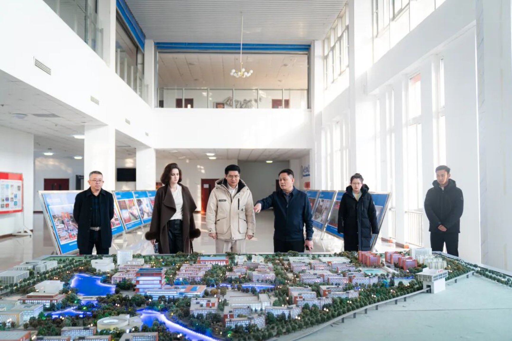 座谈会前,来访嘉宾参观了学校规划沙盘前,详细了解了学校的整体布局、发展规划与特色专业集群;并乘车途经人工湖、图书馆、桃李巷等标志性区域,实地感受校园的文化氛围与办学风貌。