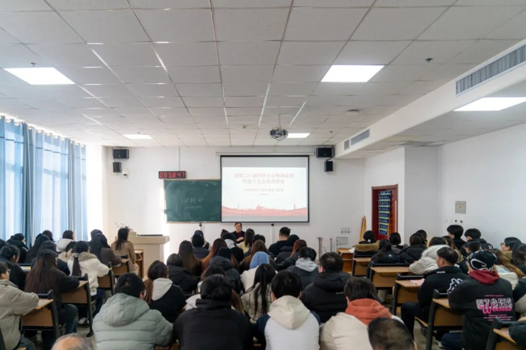 党委书记田艳玲分别走进工商管理学院与信息工程学院的课堂,以《深悟二十届四中全会精神扛起“十五五”奋进新使命》为题,为两学院学子送上了一堂兼具理论深度与实践温度的思政盛宴。课堂上,田艳玲书记立足学生关切,通过鲜活视频、典型案例与生动比喻,系统解读了二十届四中全会精神为“十五五”时期擘画的发展蓝图,深刻阐释了坚持党的全面领导、人民至上、高质量发展等核心要义。结合学校职业教育特色与专业优势,她重点分析了“十五五”时期国家在科技自立自强、现代化产业体系建设等领域对高素质技术技能人才的迫切需求,鼓励同学们打破认知误区,坚定技能成才、技能报国的信念。她寄语学子:要胸怀大志跑好时代接力棒,将个人理想融入文化传承与技术报国的使命;要珍惜时光练就真本领,充分利用学校现代化实践平台夯实立业之基;要创新创造勇当排头兵,在实践中转化创意解决实际问题;要立德为先走好人生路,恪守职业道德,弘扬工匠精神,追求德技双修。互动问答与寄语未来环节中,同学们积极发言、热烈讨论,现场气氛浓厚,充分展现了新时代大学生对国家发展的关注与思考。