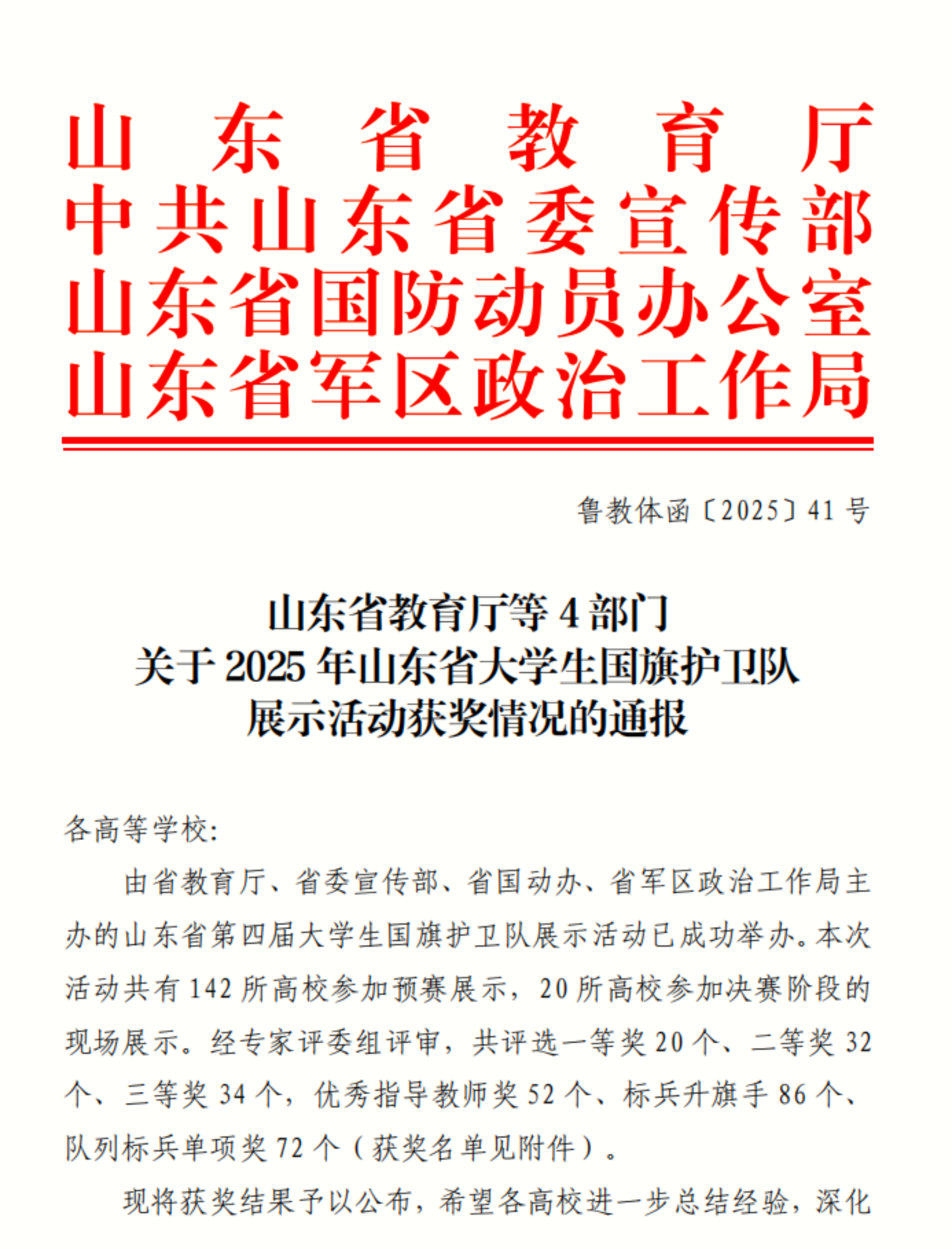 近日,由山东省教育厅、中共山东省委宣传部、山东省国防动员办公室、山东省军区政治工作局联合主办的2025年山东省大学生国旗护卫队展示活动公布获奖名单。山东文化产业职业学院国旗护卫队凭借出色表现和昂扬风貌,在全省高校中脱颖而出,荣获团体二等奖。王晓群老师获评“优秀指导教师”,王传灿、王皓同学分别荣获“标兵升旗手”“队列标兵”称号。