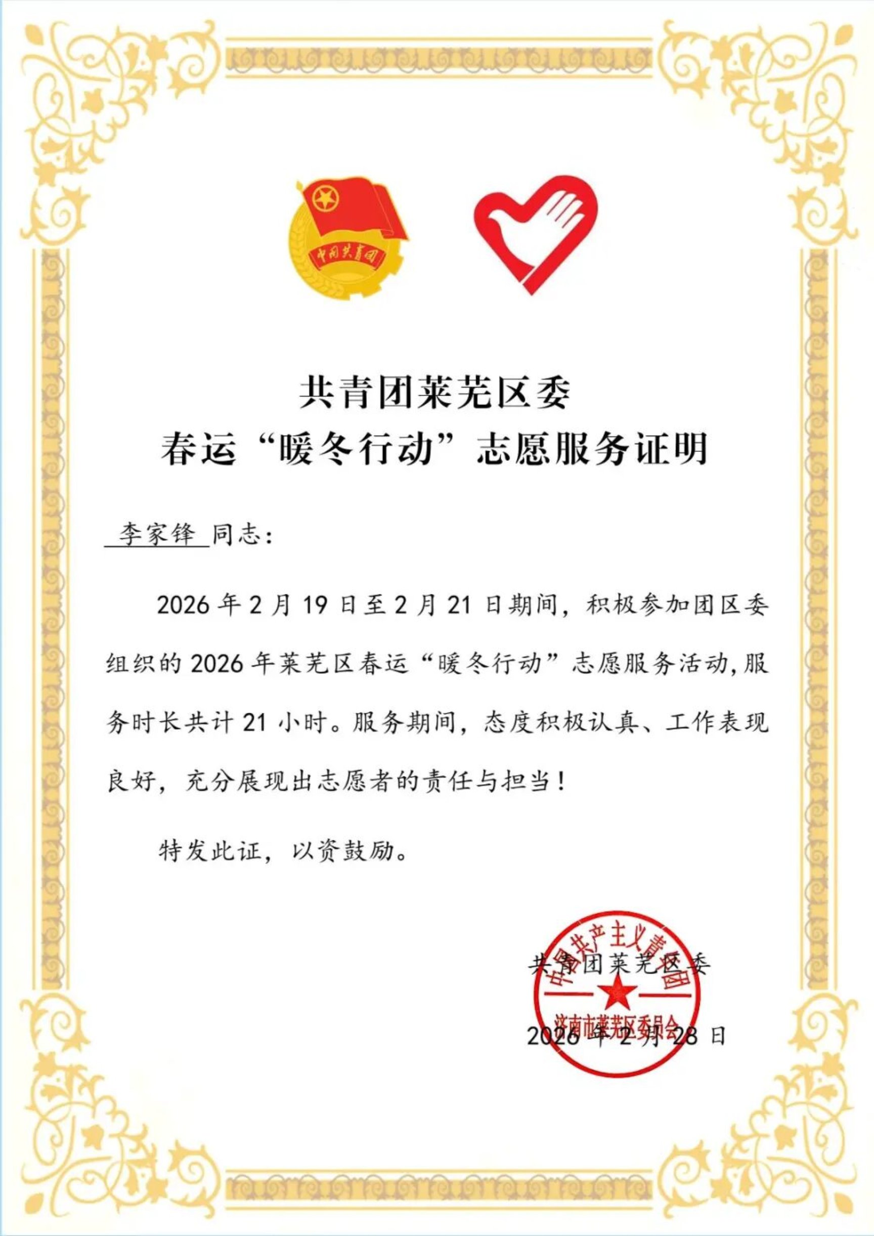 春运大幕拉开之际,轨道交通与旅游学院李家锋主动参与共青团济南市莱芜区委组织的 “暖冬行动”,在车站担任志愿服务者。他化身 “活地图” 为旅客指引方向,作为 “安全员” 维护现场秩序,争当 “暖心帮手” 帮扶老弱病残孕特殊群体,用一句句耐心解答、一次次贴心搀扶,让归乡之路更显温暖,也深化了对 “人民至上” 理念的理解。
