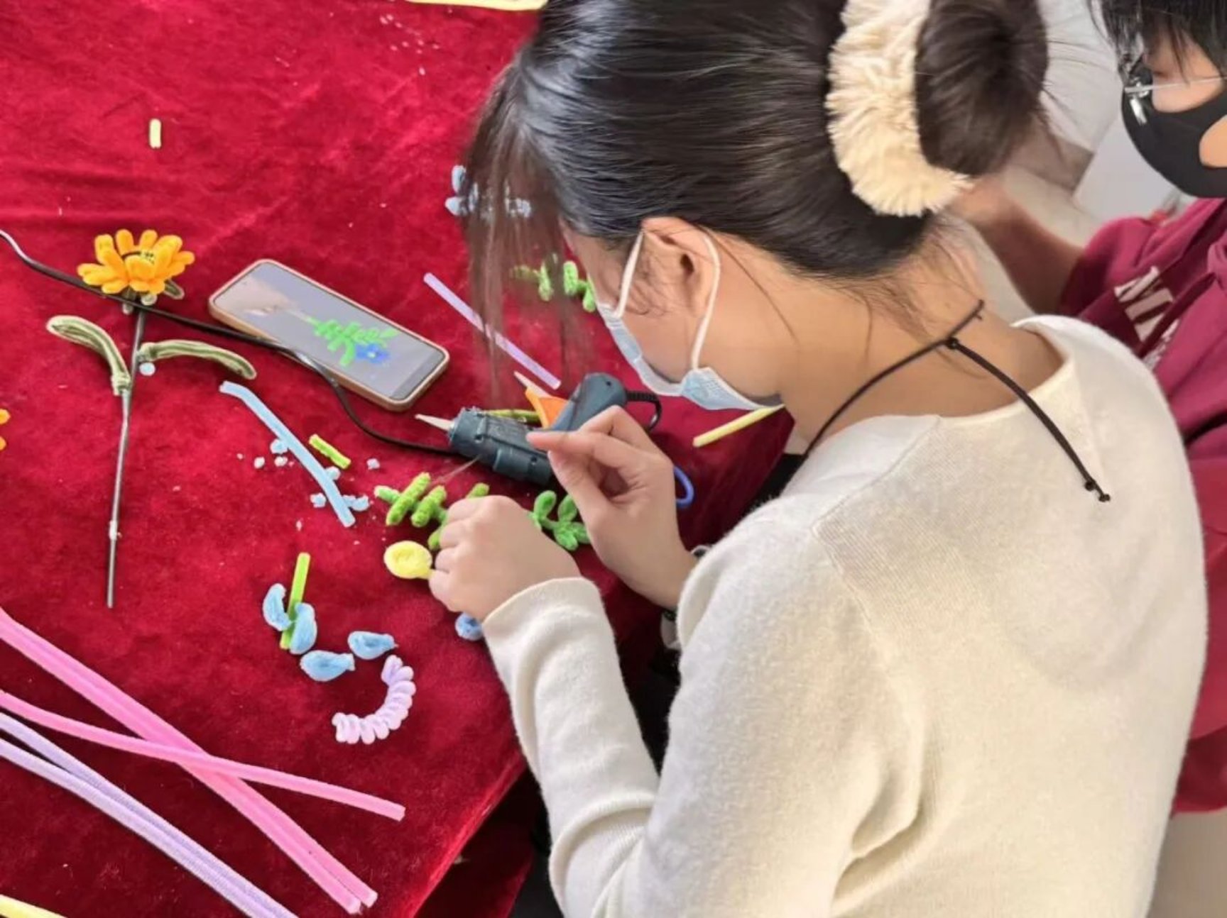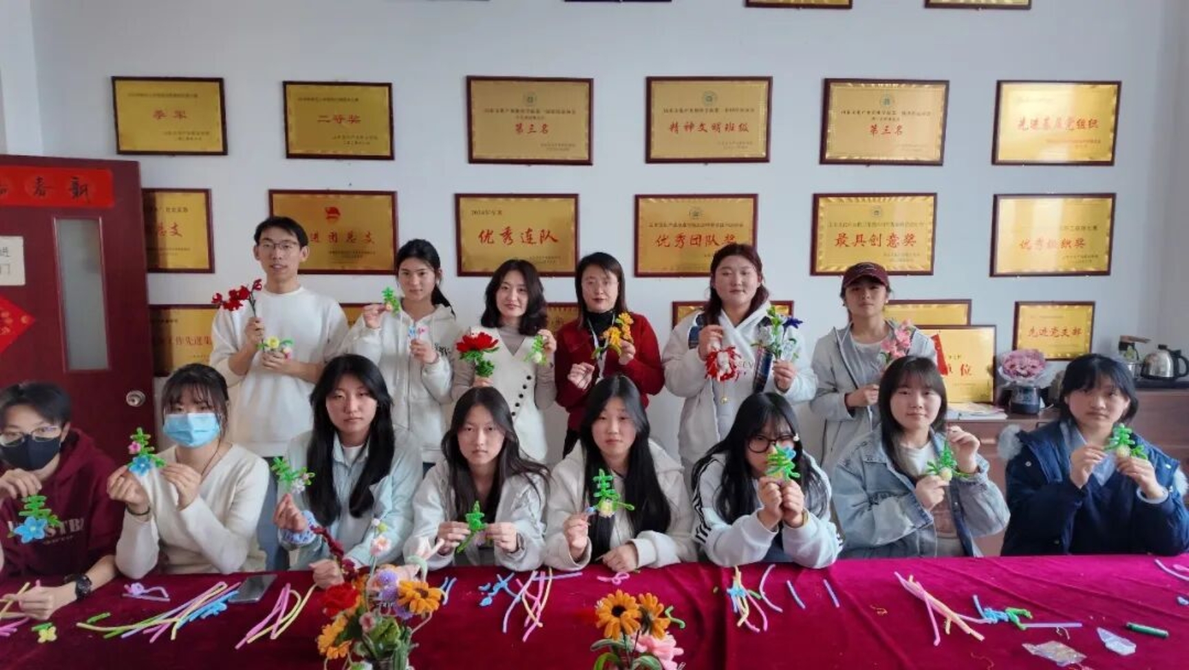 “先把扭扭棒对折拧成螺旋状,作为花瓣的基础,再用绿色扭扭棒做花茎,慢慢调整弧度就会很灵动~”学长学姐们手把手教学,从基础造型到创意搭配,细致解答同学们的每一个疑问,温柔又有耐心。遇到动手较慢的同学,学长学姐们俯身指导,双方同学之间也相互帮忙、彼此借鉴,原本陌生的距离在指尖的互动中悄然拉近。