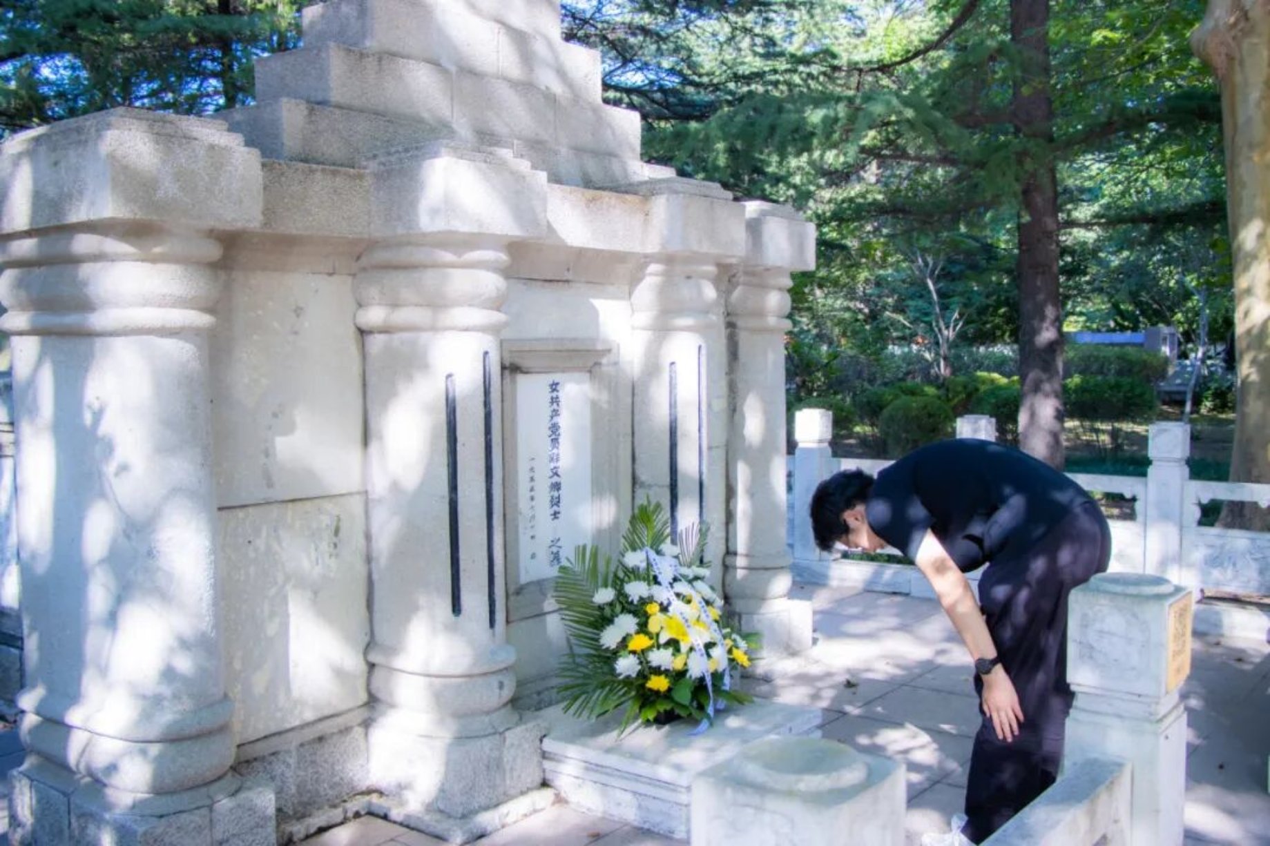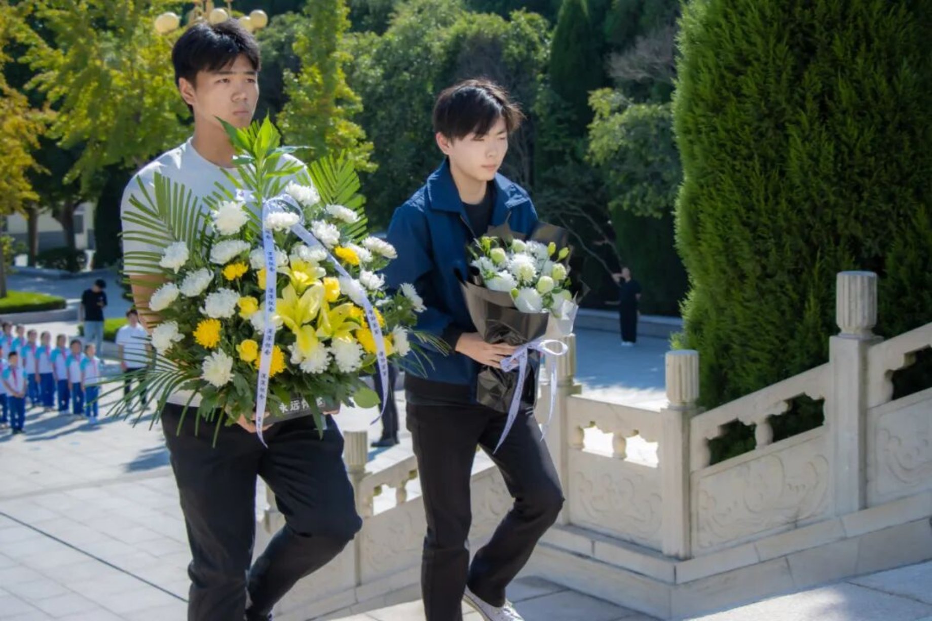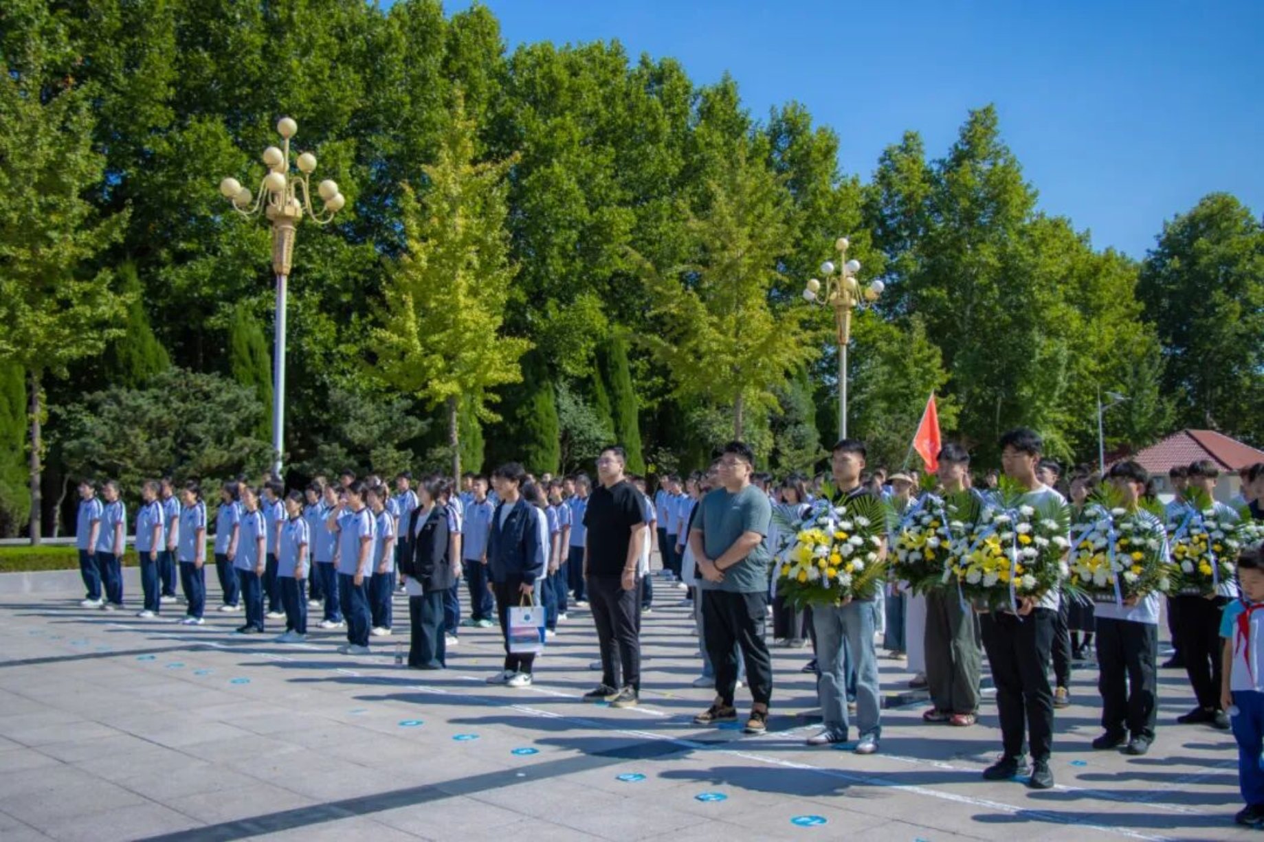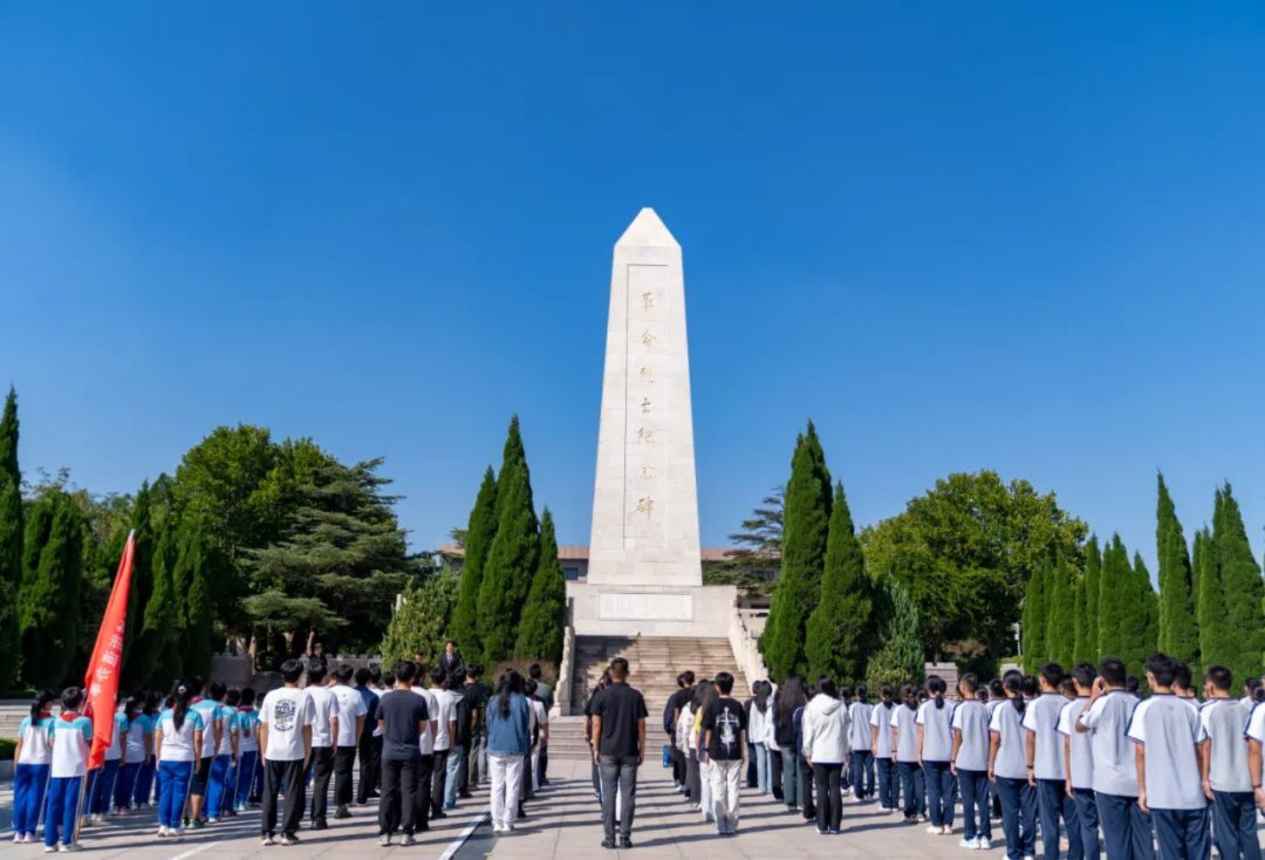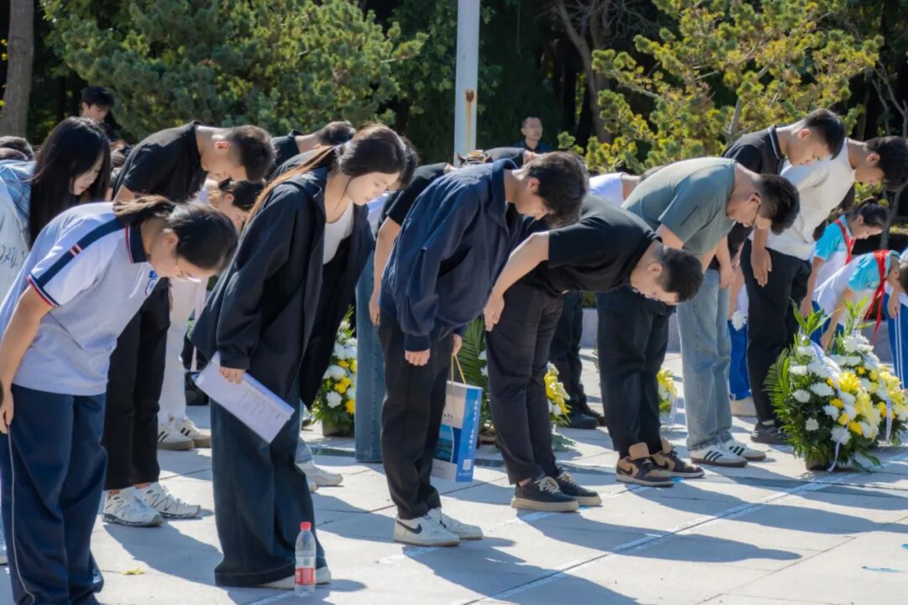 师生们庄严肃立,依次进行了奏唱国歌、默哀、鞠躬致敬、敬献鲜花、宣读祭文、瞻仰纪念碑等公祭活动。一段段可歌可泣的抗战故事,彰显着英勇无畏、坚韧不拔、爱国奉献的抗战精神,让师生们神情凝重,表达着对先烈们的崇高敬意和无尽哀思。大家深刻意识到历史记忆永不能褪色,我们应当铭记历史、缅怀先烈、珍爱和平、开创未来。