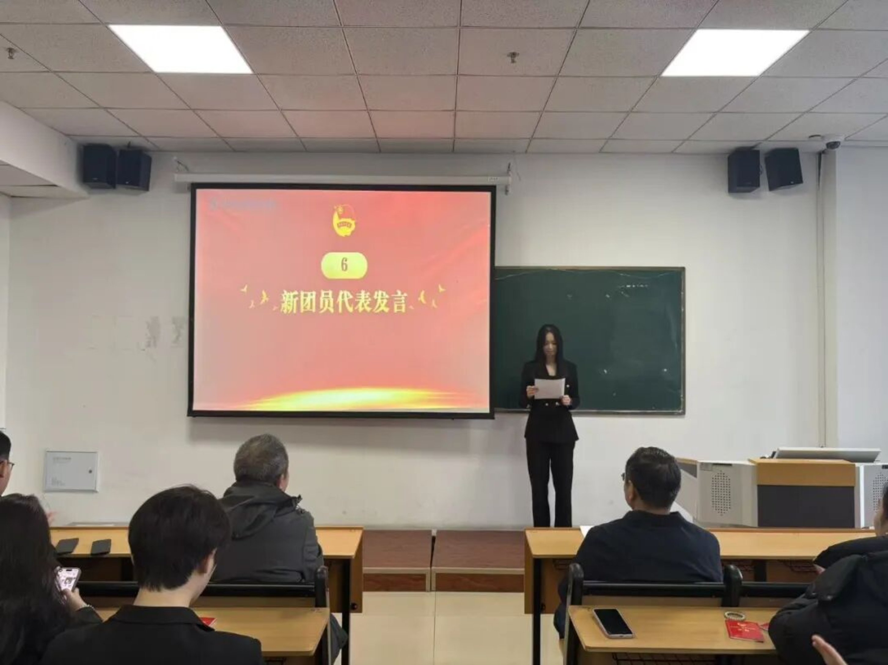 新团员代表刘妍同学发言。她表达了对加入团组织的自豪与决心。她代表全体新团员郑重承诺,将时刻牢记团员身份,勤奋学习,积极实践,努力发挥模范带头作用。她坚定表示,要将今天的誓言转化为实际行动,以青春之我、奋斗之我,为团组织增添光彩,为学院发展贡献力量。