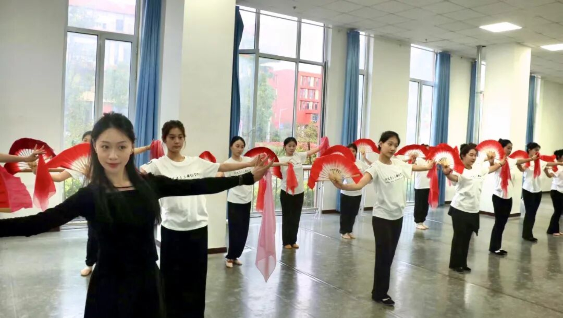 课堂上,灵动俏皮的“小嫚”们。她们踩着轻快的碎步,手腕翻飞,彩扇蹁跹,眉眼间流转着胶东小嫚的娇俏与灵动。同学们在老师的指导下领略了秧歌的动作要领,如轻盈的十字步、协调的手臂舞动和以腰为轴的扭动等。
