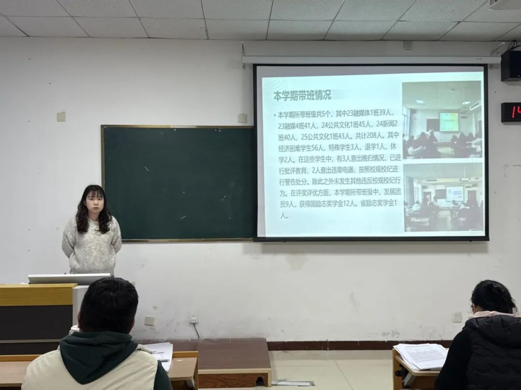 各位辅导员老师依次述职。他们结合自身分管工作,从班级管理、思政引领、心理健康教育、奖助勤贷、社会实践指导等具体工作入手,分享了与学生相处的温暖点滴,总结了育人工作中的方法与技巧,也坦诚剖析了工作中存在的短板,展现出传媒学院辅导员队伍求真务实、潜心育人的良好风貌。