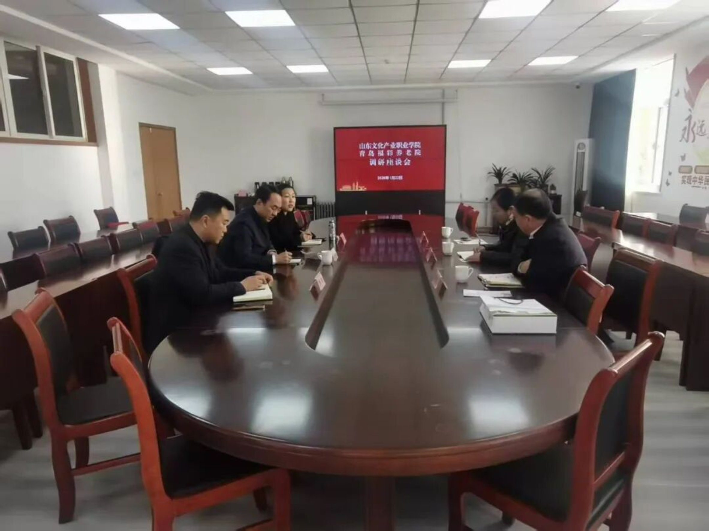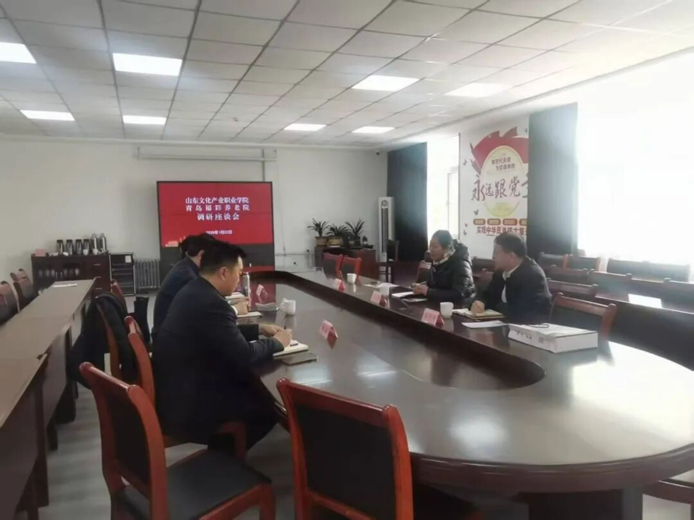 在二楼会议室,一场务实高效的座谈交流会如期举行。青岛福彩养老院党总支书记刘聚刚、院长孙倩倩、副院长韩冰与我校考察团围绕合作核心议题展开深入探讨,凝聚多项共识。
